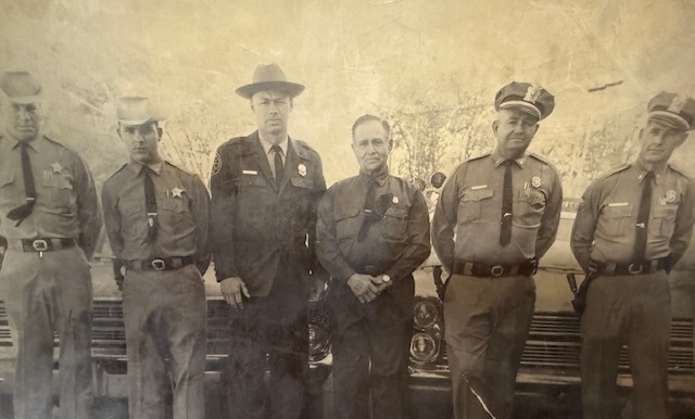 Bruce Peters is shown in 1967 with other Kearny County law enforcement officers. L-R: Sheriff Joe Coyne, Undersheriff Fred Hendrickson Jr., State Game Protector Bruce Peters, Deputy Sheriff Harley Rector of Deerfield, Lakin City Police Officer L.C. “Chief” Blankenship, and Police Chief Earl “Blackie” Cox.